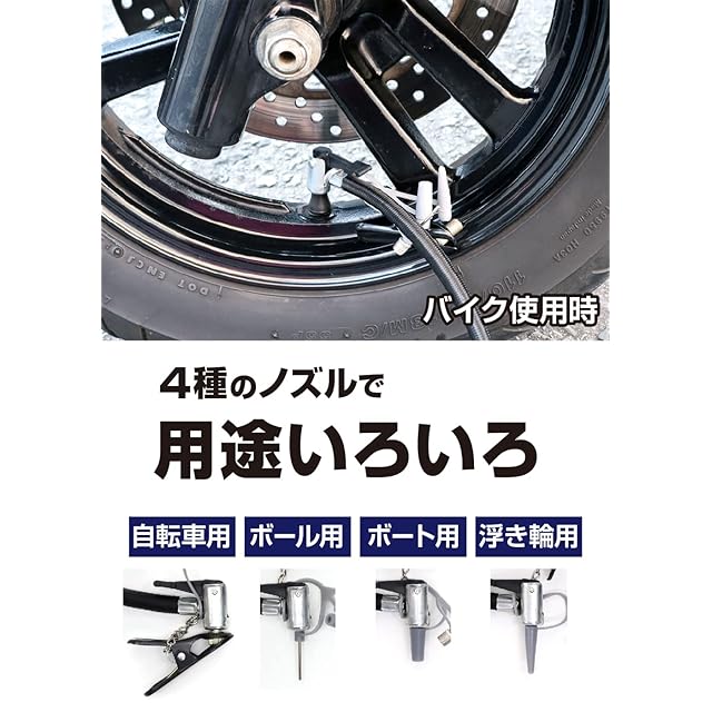 [ 最高圧力 ]約700kpa [ 付属品 ]バイク用・自転車用・ボール用・ボート用・浮き輪用ノズル [ メーター表示 ]0~700Kpa [ エアーホースの長さ ]約600mm