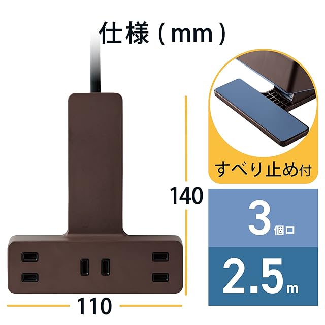 机などに挟んで利用することができるクリップ機構を搭載した2ピン式の3個口タップです。固定使用だけでなく、タップを常設できないダイニングテーブルなどでテレワークや宿題をする際に、一時的に設置して利用するのにも便利です。コードの長さは2.5mです。