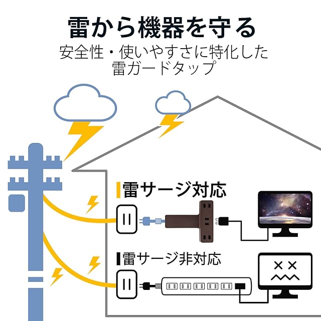 誘導雷による最大12500Vまでの雷サージを吸収する素子(バリスタ)を搭載し、接続機器を保護します。(※最大サージ電圧12500VはJEC210/212規格に基づく数値です。受けた電圧や回数により性能は劣化します。)