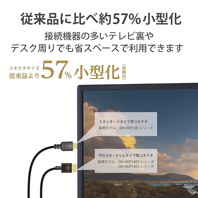 従来品に比べ約57%小型化した、接続機器の多いテレビ裏でも干渉せず接続できる小型コネクタを採用しています。※DH-HDPSシリーズと比較。