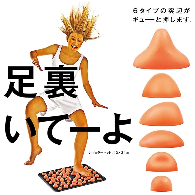 「足裏いてーよ」は、通常の足つぼマットでは物足りない方に向けた、刺激強めの設計が特徴です。大小6タイプの突起が足裏にしっかりとフィットし、踏むだけで独特の痛気持ちよさを体感できます。青竹踏みでは満足できなかった方にもおすすめのアイテムで、毎日のセルフケアに取り入れやすいサイズ感です。