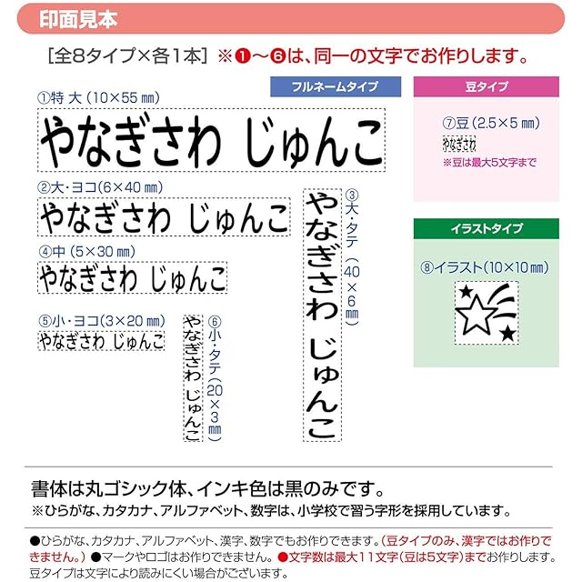 【印面サイズ】フルネームタイプ 特大(10×55mm) / 大 ヨコ(6×40mm) / 大 タテ(40×6mm) / 中(5×30mm) / 小 ヨコ(3×20mm) / 小 タテ(20×3mm)、豆タイプ (2.5×5mm)、イラストタイプ (10×10mm)