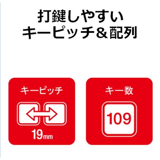 打鍵しやすいキーピッチ19mmと日本語109キー配列を採用し、快適なタイピングが可能です。