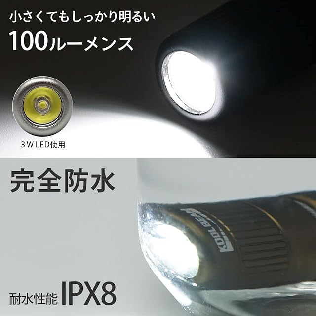 KOOLBEAM KB-41 M.E.U ミニ LEDライト<br><br> 携帯に便利な超小型のLEDライトです。<br><br> 親指ほどの大きさで、明るさは100ルーメン。<br> いざという時に手元や足元を照らすのに便利な明るさがあります。<br><br> 耐水性能IPX8の完全防水!<br> 水に濡れても大丈夫!<br><br> キーリング付きなので、普段使いのバッグや、避難用袋、<br> 家のカギやスマホストラップなどに着けての<br> 持ち歩きに大変便利です。<br><br> [商品仕様]<br> 使用電池:ボタン電池 LP44 × 3個(モニター用電池付き)<br> 明 る さ :最大100ルーメン<br> 連続使用:最大168時間<br> 防水性能:IPX8(完全防水)<br> 材 質:アルミニウム<br>