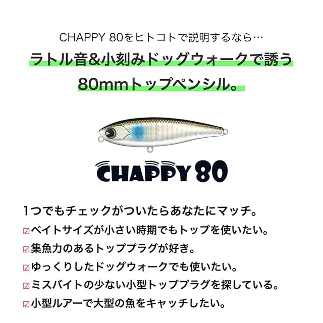 コンセプト:【CHAPPY 80】……簡単にできるドッグウォーク&魅惑の金属ラトル音&スプラッシュ・バブルアクションでシーバスに強烈アピール! 一口サイズで初夏の小型ベイトに最適なサイズ設定。
