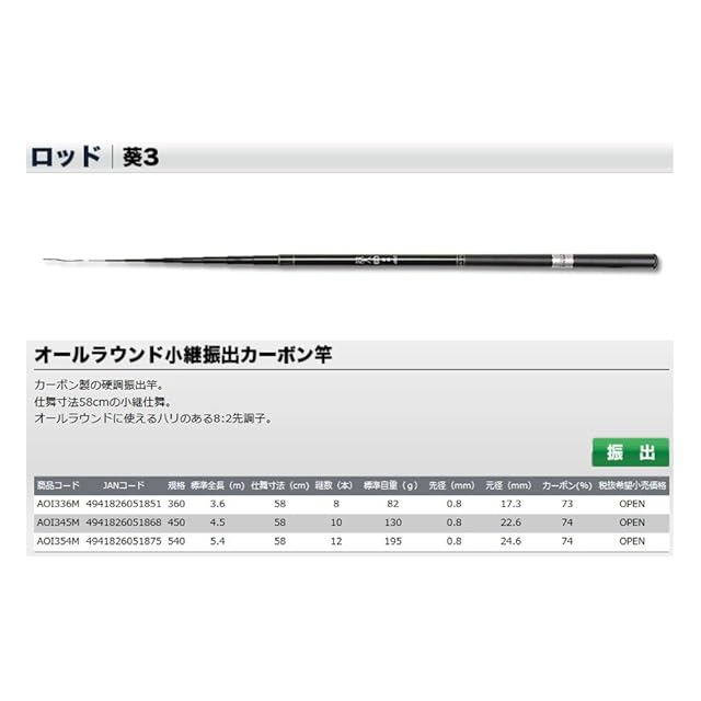商品名:大阪漁具(OGK) 葵3(硬調) 450 AOI345M オールラウンド小継振出カーボンロッド