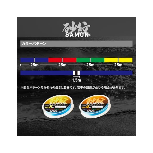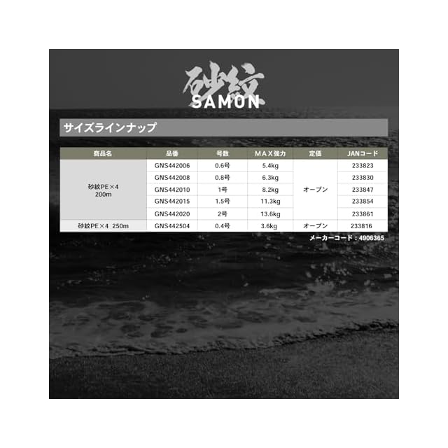 日本製 / シリーズ:【砂紋 PE×4】……サーフフィッシングに革命をもたらした国産PEラインのパイオニア「砂紋」! 目指したのは「投」の新たなる原点!! 特殊樹脂コーティングとMPX製法による「4本編組PEライン」。適度なハリによる使いやすさと飛びのベストバランスを追求!