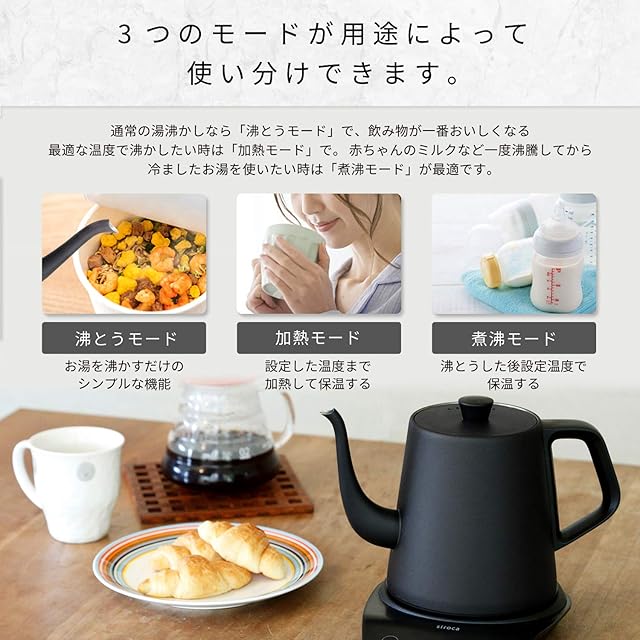 ボタンを押すだけで飲みたい飲み物の温度に合わせて、お湯が沸かせます。(紅茶:100℃、コーヒー:82~96℃、玉露:60℃など) 1℃単位でお好みの温度に設定も出来ます。