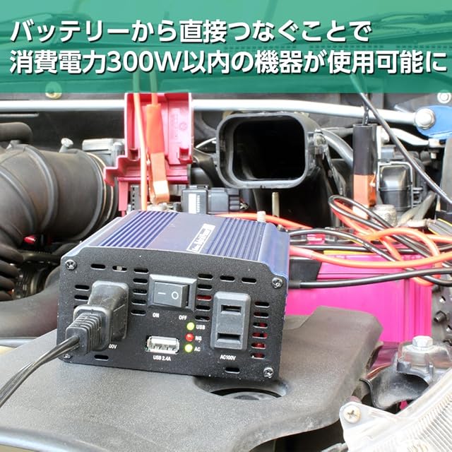 ●定格出力:120W(アクセサリーソケット使用時)、300W(バッテリー端子使用時)●最大瞬間出力:150W(アクセサリーソケット使用時)、350W(バッテリー端子使用時)●変換効率:75%