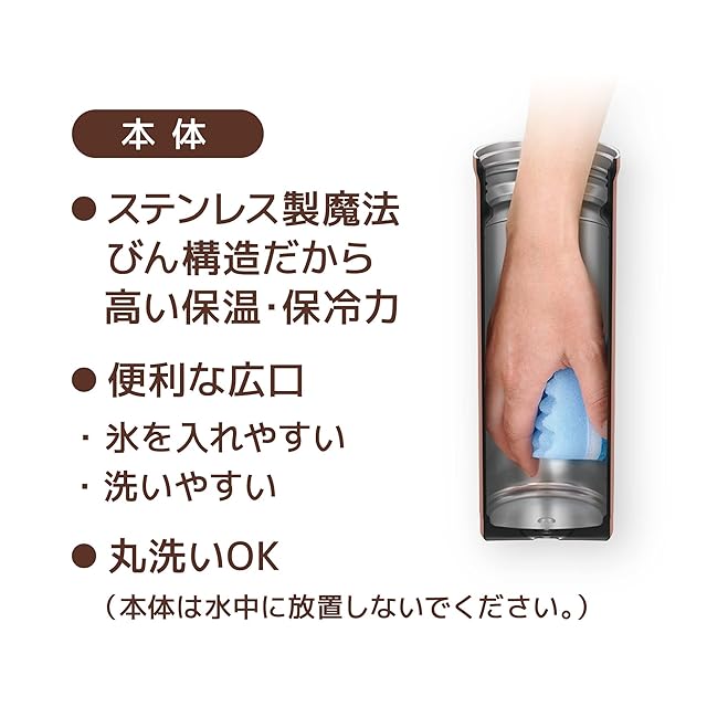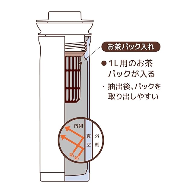 素材・材質:内びん:ステンレス鋼 / 胴部:ステンレス鋼(アクリル樹脂塗装) / フタ:ポリプロピレン(発泡ポリプロピレン内蔵) / 中せん本体、お茶パック入れ:ポリプロピレン / フタパッキン、シールパッキン:シリコーンゴム