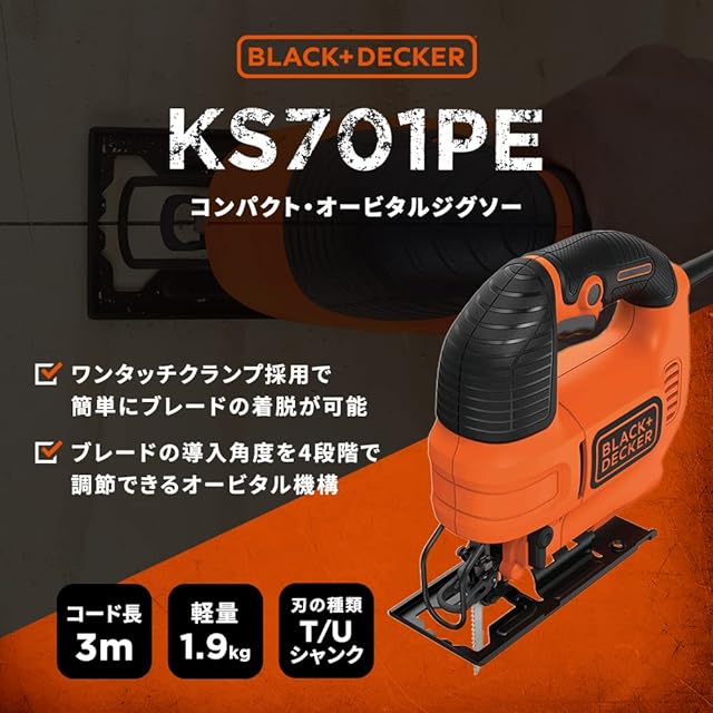 ブラックアンドデッカー(BLACK+DECKER) コード式 コンパクト オービタルジグソー DIY 電動工具 切断工具 ワンタッチクランプ 4段階 角度 調節 100V KS701PE