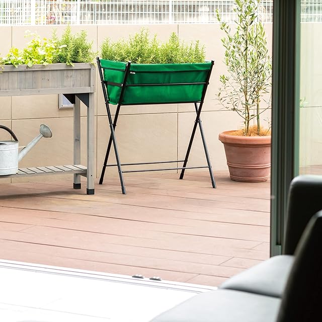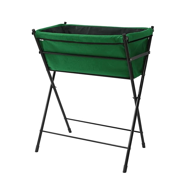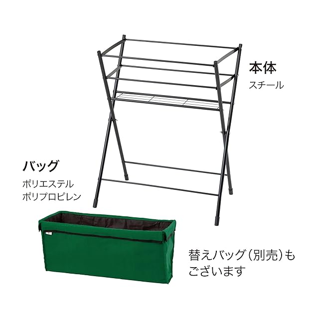 材質と塗装: フレームはスチール製で、ポリエステル樹脂粉体塗装(グリーン)が施されており、屋外での使用に耐える耐久性と耐候性を持ちます。バッグはポリエステル・ポリプロピレン製です。