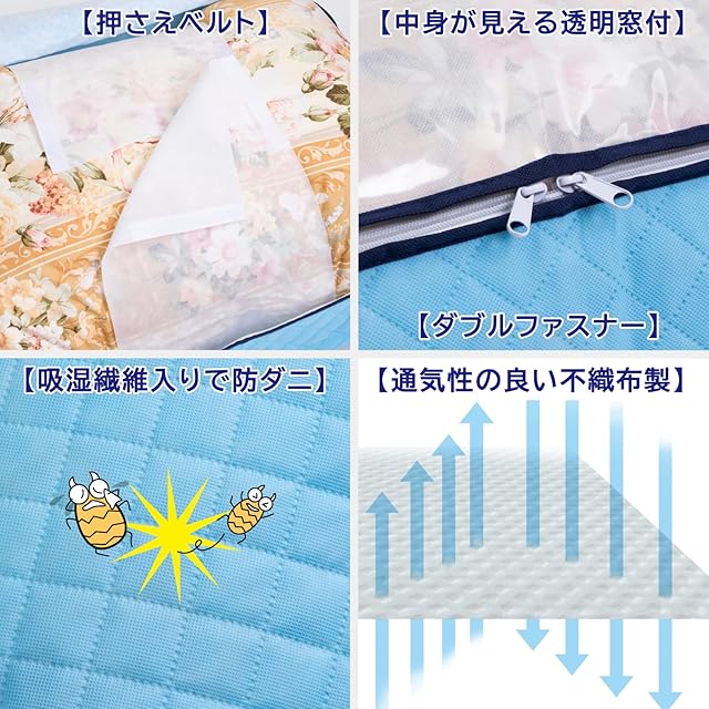 【吸湿繊維入りで防ダニ】:吸湿することでダニの繁殖を抑制し、ダニを寄せ付けずに羽毛布団を保管。