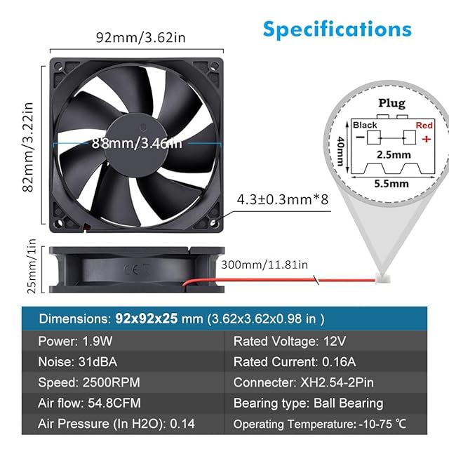 DCブラシレスファン12V:定格電圧:12V 0.16A;スピード:2500RPM;風量:54.8CFM;ノイズ:31dBA;コネクタ:XH2.54-2ピン;ケーブル長さ:30cmまたは12インチ