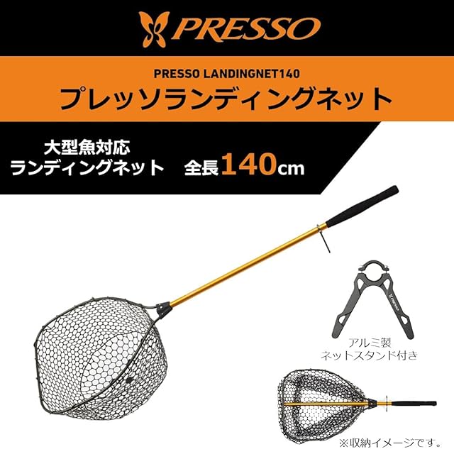 使用しない時は、シャフトを収納可能。ネットは、魚に優しいラバーネット。 PRESSOのロゴ入りネットスタンド付き