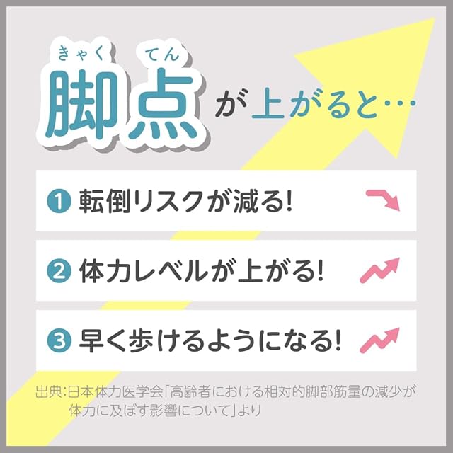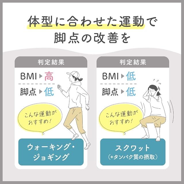 脚の筋肉量を点数化した「脚点」を表示 ・体重を支えるだけの脚の筋肉量があるかを「脚点」として点数化 ・「脚点」は50~150 ポイントで表示され、点数に応じて「良い」「やや低い」「低い」の3段階で判定 ・加齢の影響を受けやすい脚の筋肉量をチェックして、脚力低下に早めの対策を 毎日の継続した測定をサポート ・体重が急激に変化した場合にお知らせする「体重急激増減お知らせ機能」付き ・測定の継続状況にあわせて表示画面が変化する「マイサポ」で毎日の測定継続をサポート こだわりの使いやすさ ・乗るだけで測定ができる「乗るピタ」を搭載 ・立てかけ収納OK ・26mmの薄さで乗りやすい