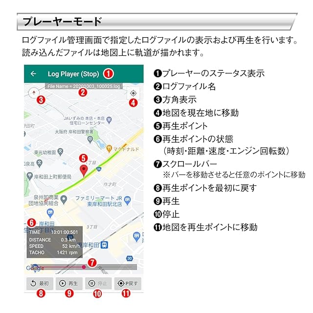 GPSのログファイルを利用してGoogle map上に走行記録を表示できます。