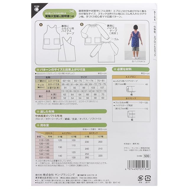 商品名:型紙・パターン フィットパターンサン 小学生 エプロンとスモック 小学生男女 5134