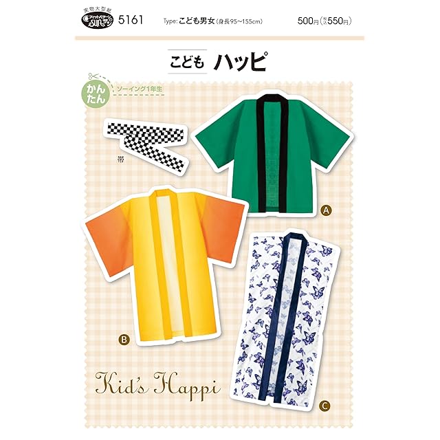 お祭り・学校行事・イベント・コスプレなどに、筒袖、長袖、袖なし、着丈3種のデザインが選べます。帯の型紙つき。直線縫いが中心なので短時間で仕上がります。