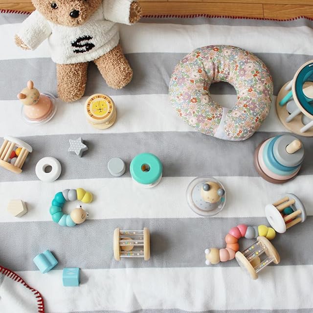お部屋に散らばっていても可愛く見えちゃう優しい色合いの木製おもちゃ。
