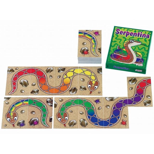 ポータブルな箱入り、カードゲーム、「レインポースネーク」。別名「虹色のへび」ともいいます。パッケージ原語(ドイツ語)表記ですが、わかりやすい日本語のゲームルール説明書が内包されています。 カラフルなヘビの身体の1部が描かれたカードを使って、絵合わせゲームです。ヘビの身体の1部はグラデーションで描かれています。カードとカードのグラデーションがあうように絵合わせしていきます。絵合わせより色合わせになるので、小さいお子さんでも時間がかからずに認識できるので、ゲームをスムーズにすすめることができます。 場に裏返したカードの山をいくつか作ります。手番がきたら、好きな山からカードをめくり、場のカードとグラデーションをあわせておきます。グラデーションが合せられない場合には、あらたなヘビを作っていきます。 へびの頭としっぽがそろったら、そろえた人がそのへびのカードをもらいます。短いヘビも長いへびもできますよ。たくさんのカードを持っている人が勝ちというゲームです。 めくったカードと場のカードの状況でゲームが動きます。小さいお子さんが大人を負かすことも。 はじめてのゲームとしておすすめです。