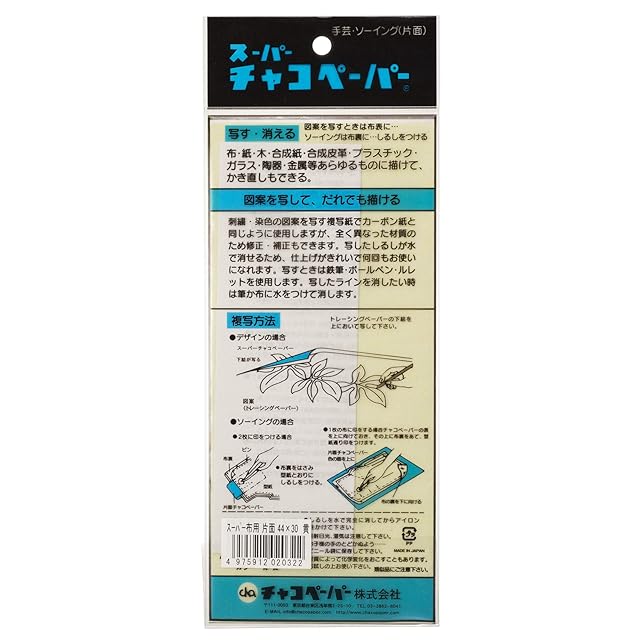 スプレーなどの少量の水でしるしが簡単に消せる「スーパーチャコペーパー」。布用はルレットでの複写に最適。図案写しや、しるし付けに。