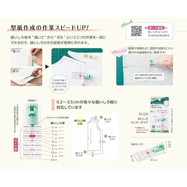 0.3~3.5cmの様々な 縫いしろ 幅 に対応しています。 脇線 や 裾線 など、 直線 定規 では書きにくいゆるやかな カーブ も簡単に 作業 できます。