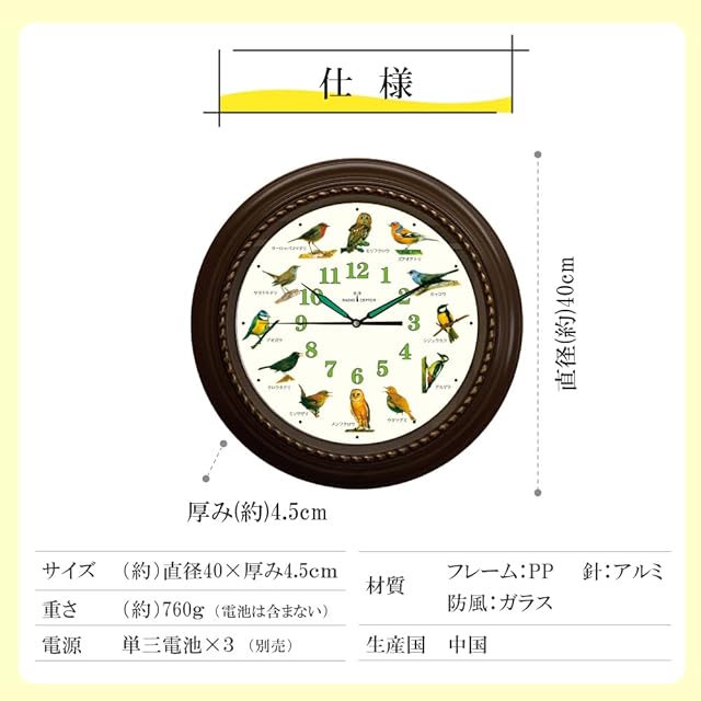 商品名:野鳥の電波時計 掛け時計 安眠機能 直径40cm 大型 レトロ 壁掛け時計 インテリア 静音 癒し 小鳥のさえずり Bird Clock