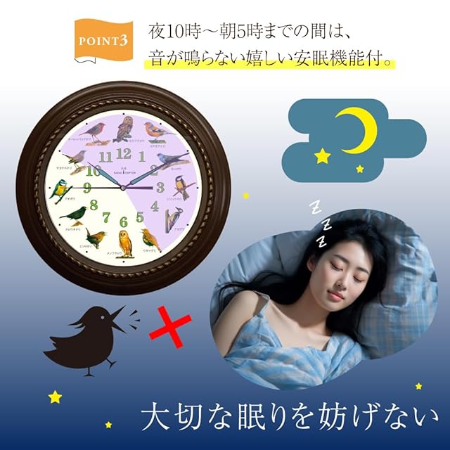 【安眠機能】夜10時から朝5時までの間は音が鳴らない嬉しい安眠機能付き。朝の目覚めを鳥のさえずりで などはいかがでしょうか。