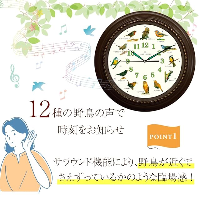【正確な時刻を鳥のさえずりでお知らせ】正確な時刻情報をのせた電波を受信することにより現在時刻を表示する時計です。サラウンド機能でまるで野鳥が近くでさえずっているような臨場感が味わえます。