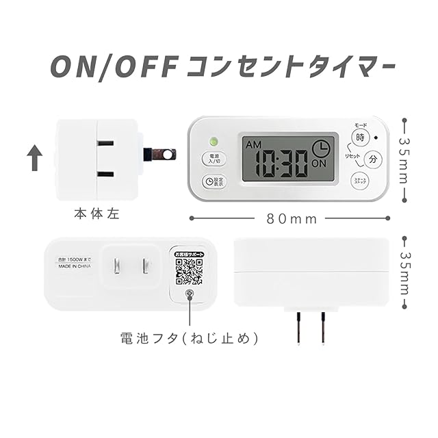 電池式を採用し、狭い場所にあるコンセントに使用する際に手元で設定できます。(電池なしでもコンセントに刺せば使用できます)