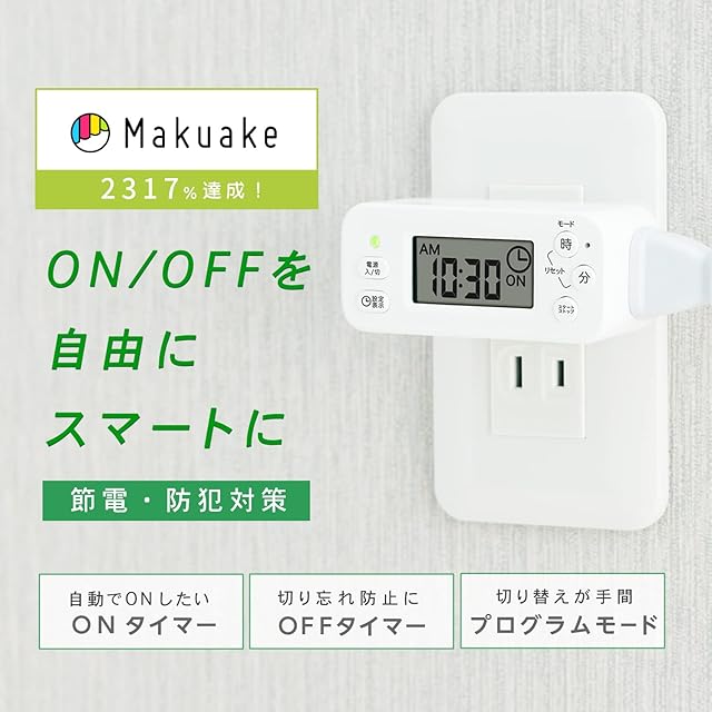 クラウドファンディングでも多くのごサポートをいただいたON/OFFコンセントタイマー!タイマーモードとプログラムモードがこれ一台に搭載され、電源のオンオフをスマートに自由に切り替えられます。