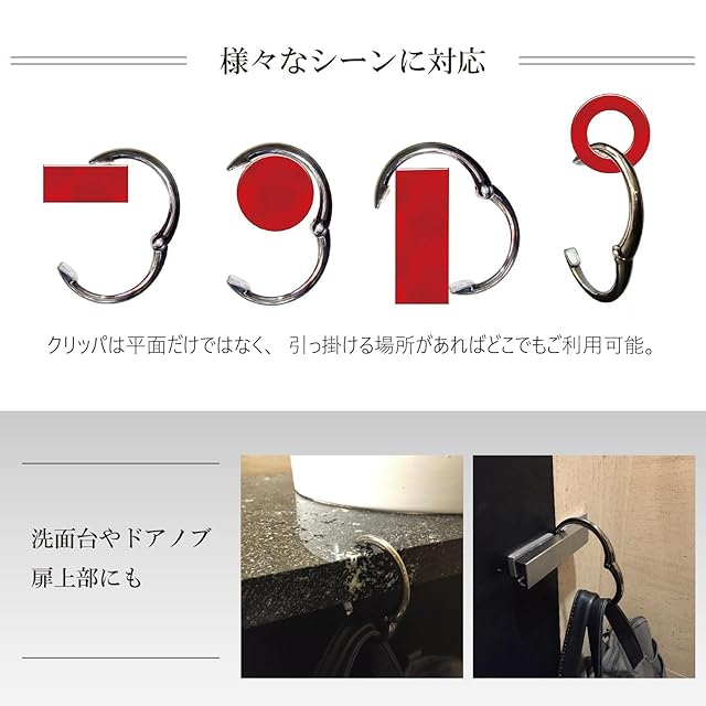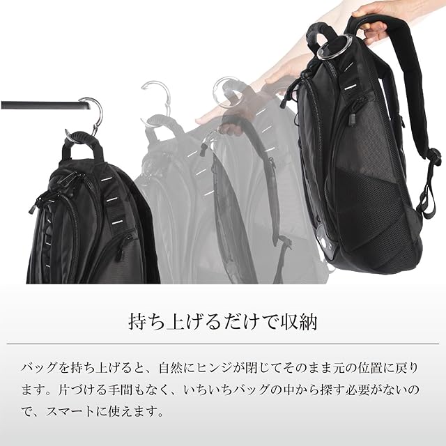 耐荷重15kgで抜群の安定感。究極のバッグハンガー。【特長】・耐荷重15kgで抜群の安定感をほこる、究極のバッグハンガー。・性能とデザインを研ぎ澄ましたシンプルなデザインです。・バッグの持ち手に付けて、掛けたい場所が決まったら、開いて、引っ掛けるだけ。・平らな平面だけではなく、車のヘッドレスト、テーブルなど引っ掛ける場所があればどこでもご利用いただけます。・外出先で、お部屋の中で、移動の途中で、さまざまな場面でお使いいただけます。・約6cmまでの厚みのテーブルに引っ掛けることができます。・テーブルなどの表面に接触する樹脂パッドは、接触する場所を傷つけず、さらに滑り止めの機能も兼ね備えています。・使い終わってバッグを持ち上げると、そのままヒンジが閉じて、バッグの持ち手に戻ります。・表面加工にもこだわり、摩擦による磨耗や剥がれなどに対する耐久性が高く、傷が付きにくい仕上げです。【使用方法】(1)掛ける場所が決まったらバッグの持ち手に付けてください。(2)バッグを持ち上げるだけでヒンジが開きますので、お好きな場所に引っ掛けてください。