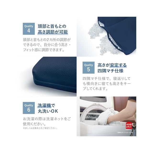 【洗濯機で丸洗い】清潔を保つことは快適な睡眠に不可欠です。モリピロの枕は、洗濯機で簡単に丸洗いできるので、いつでも清潔に保てます。衛生的な環境で、肌トラブルやアレルギーも予防しましょう。