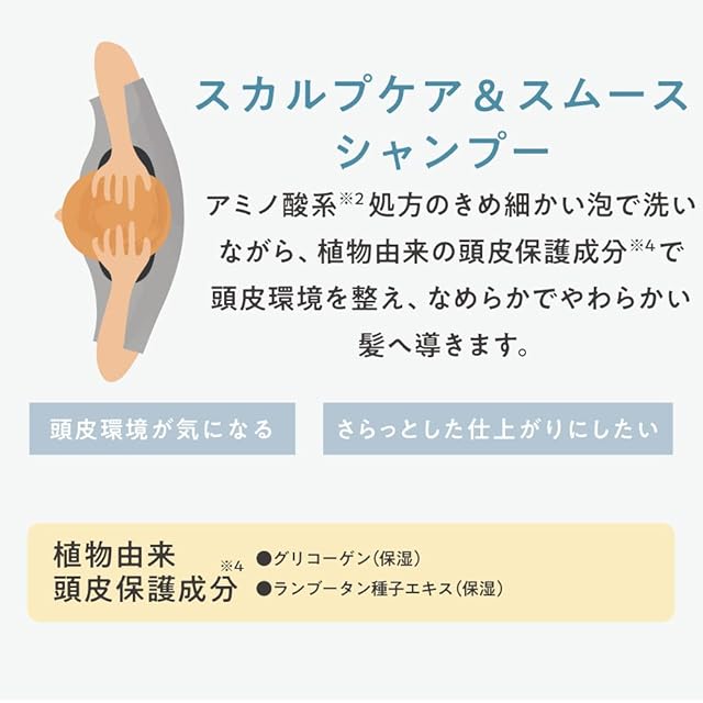 【スカルプケア&スムースシャンプー】アミノ酸系※2 処方のきめ細かい泡で洗いながら、植物由来の頭皮保護成分※4 で頭皮環境を整え、なめらかでやわらかい髪へ導きます。※1 リンゴ果実培養細胞エキス、加水分解ローヤルゼリータンパク、カカオエキス、セイヨウニンジンボク果実エキス(全て保湿)、※2 ココイルメチルタウリンNa(洗浄)、※4 グリコーゲン、ランブータン種子エキス(全て保湿)