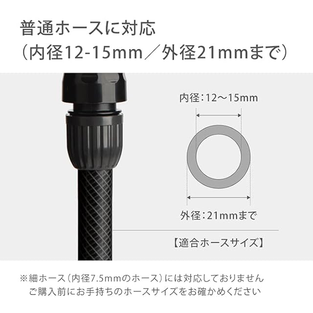 普通ホース(内径12-15mm/外径21mm)に対応しています。