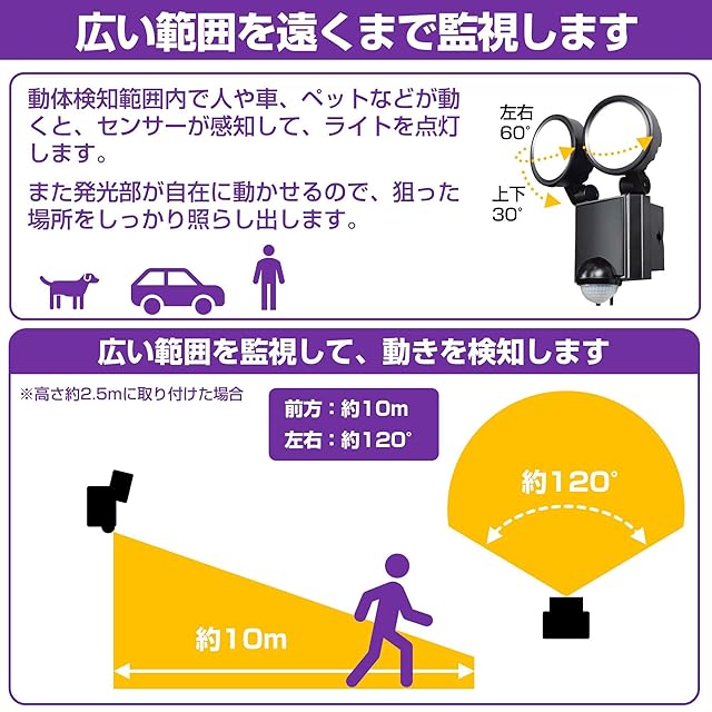 商品名:エルパ (ELPA) LEDセンサーライト2灯 防犯 約3.0m 耐水性能:IPX4(防沫形) ESL-SS802AC
