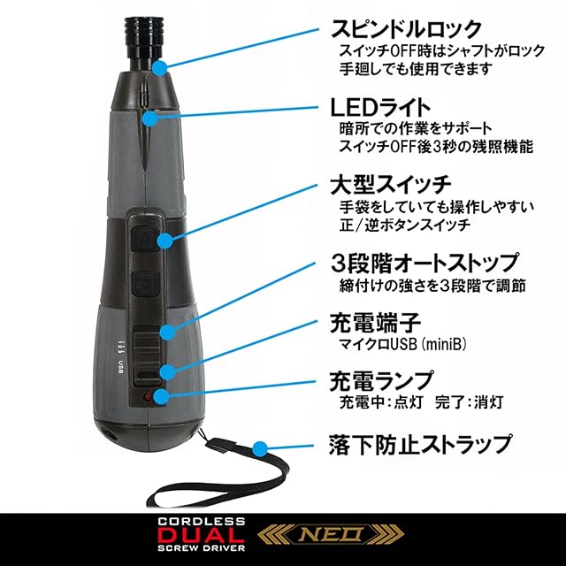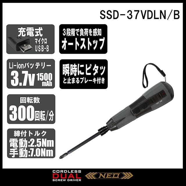商品名:SK11(エスケー11) デュアルドライバー NEO 電動と手回しのデュアルドライブ USB充電 SSD-37VDLN/B グレー