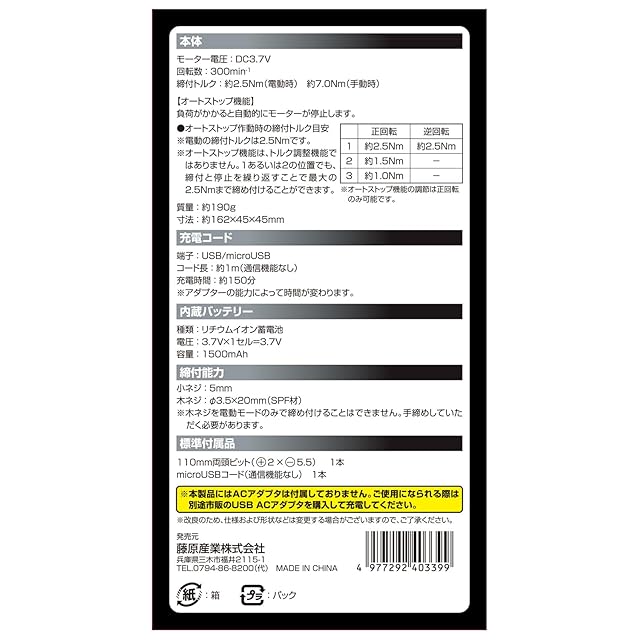 無負荷回転数:300min-1(ブレーキ機能付き)、最大締付トルク:(電動時)2.5Nm・(手動時)7.0Nm、オートストップ作動時トルク(正回転のみ):1.0Nm・1.5Nm・2.5Nm