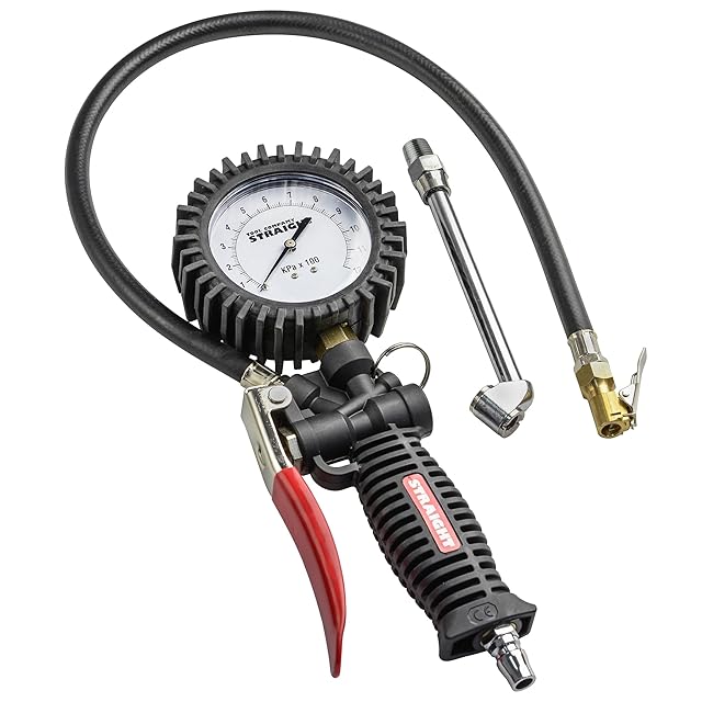 タイヤの空気圧を測定しながら空気を入れることができるタイヤインフレーターゲージです。<br />読み取りやすい大型メーター(79mm)を採用。<br />1レバーで空気圧の測定、加圧、減圧操作ができ作業効率が上がります。<br /><br />[測定範囲] 0~1,200(kPa)<br />[精度] ±1.8%<br />[最高使用空気圧力] 1,200kPa<br />[ホース長] 600mm<br />[ゲージサイズ] 79mm<br />[インレットサイズ] 1/4(オネジプラグ付き)<br />[適応バルブ] シュレーダーバルブ<br /><br />■用途に合わせて交換できる2種類のエアーチャック付(ロックタイプ、デュアルヘッドタイプ)<br />■ゲージはラバープロテクター付で、衝撃からゲージを保護します。<br /><br />[注意] ▲本品のみでは作動いたしません。<br />本品を使用するためにはエアーコンプレッサーやエアーホース等の機器が別途必要になります。<br />▲ゲージの指示精度を確保するため、空気圧の調整は減圧で行わず加圧で行ってください。