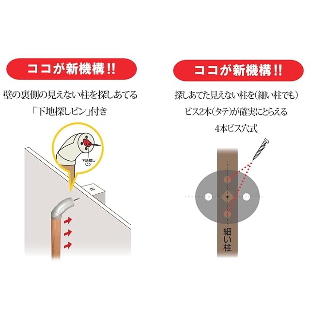 仕様:丸棒/ゴム集成材(塗装)、ブラケット/ZDC2(亜鉛ダイカスト)シルバー塗装、ブラケットカバー/PP(ポリプロピレン)、付属ビス/ナベタッピング4X50mm(8本)、下地探しピン/ABS樹脂(針長:22mm)