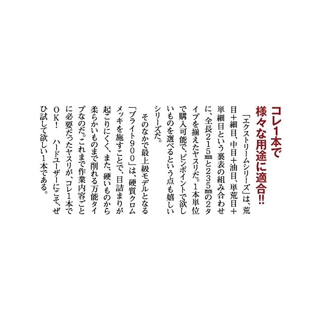 【特長】<br>●表と裏で目の粗さが違うので、表で荒削り、裏返して仕上げと、作業性が向上します。<br>●表面に硬質クロムを施す事により高耐久性と信じられないほどの切り粉のはく離性を実現しました。<br>●エクストリームという新感覚のヤスリです。<br><br>【用途】<br>●アルミ、鉛、プラスチックなど目がづまりやすいワーク用です<br><br>【使用】<br>●タイプ:表 中目 裏面 油目<br>●全長(mm):215<br>●刃長(mm):110<br>●形状:平<br>●刃幅(mm):11<br>●刃厚(mm):3.5<br>●質量(g):60<br><br>【材質/仕上】<br>●合金工具鋼(SKS-8)<br><br>【セット内容/付属品】<br><br>【注意】