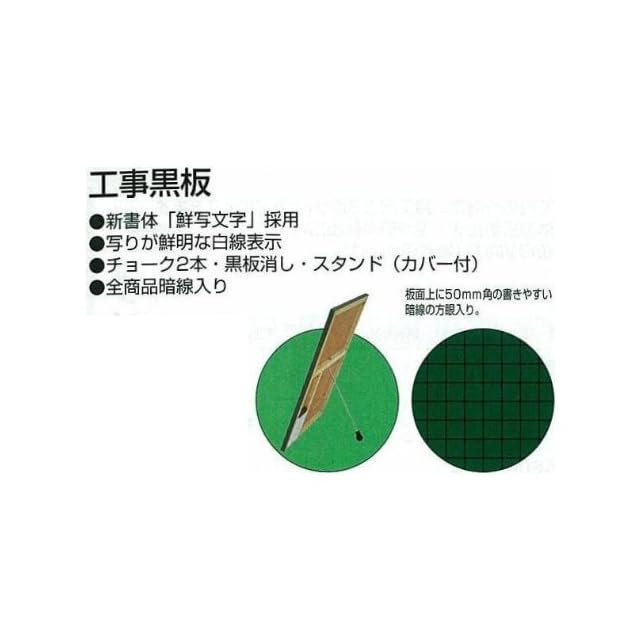 暗線入(50mm角) 緑色板面 表示内容 工事名 工種 撮影月日 位置 設計寸法 実測寸法 立会者 略図 写りが鮮明な白線表示 チョーク2本・黒板消し・スタンド(カバー付) 全商品暗線入り