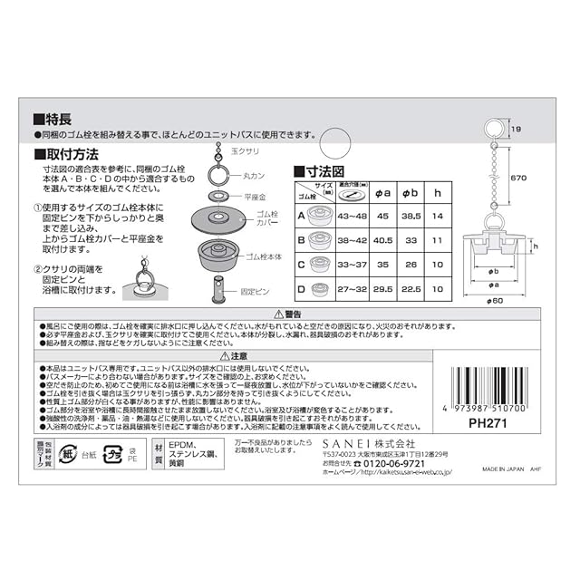 【取付方法】1.使用するサイズのゴム栓本体に固定ピンを下からしっかりと奥ま差し込み、上からゴム栓カバーと平座金を取付けます。2.クサリの両端を固定ピンと浴槽に取付けます。