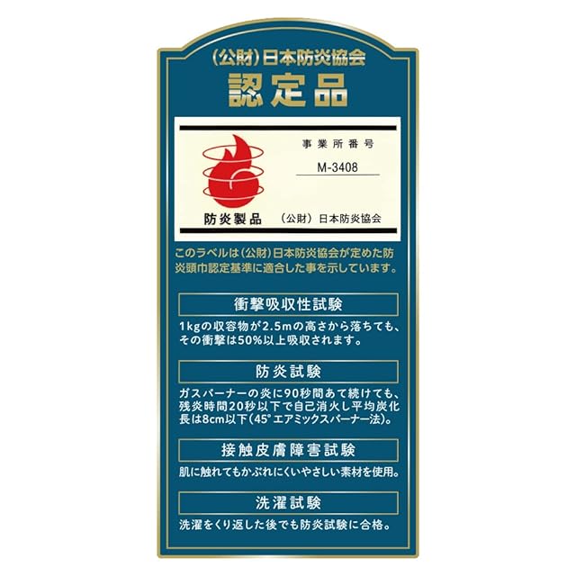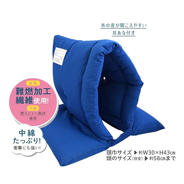 【仕様】(公財)日本防災協会認定品(M-3408)。外の音が聞きやすい耳穴付き。ゴムバンドは取り外し可。頭のサイズは約58cmまで