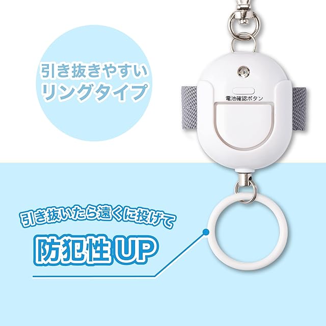 本体は抗菌加工で清潔・安心。電池確認ボタン付きで電池の残量をチェックできます。ピンプラグは引き抜けるタイプ。プラグを抜いて投げることで引き抜けないタイプと比べてすぐに音を止めにくい構造です。緊急時により安心できる構造です。