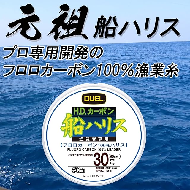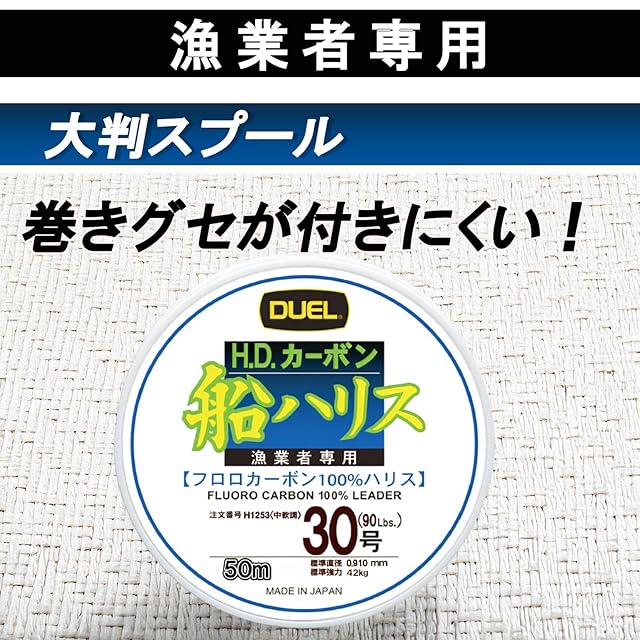 デュエル「H.D.カーボン船ハリス」は、沈みが早い・水中で見えにくい・吸水せず紫外線に強い、といったフロロカーボン独自の特性はそのままに、特殊フッ素系強化樹脂加工による鋭い水切れと耐摩擦性を加え、基本性能を飛躍的に向上しました。