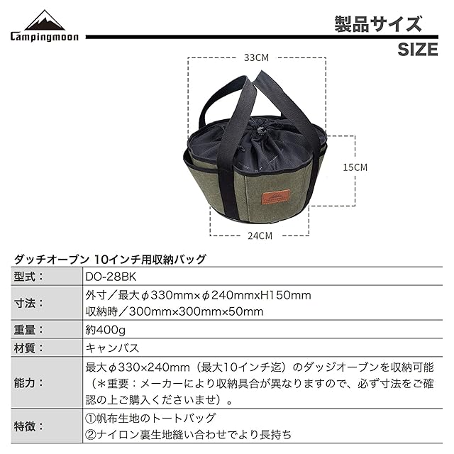 商品名:キャンピングムーン(CAMPING MOON) ダッチオーブン ケース 帆布製 10インチ ダッジオーブン用 収納バッグ DO-28BK