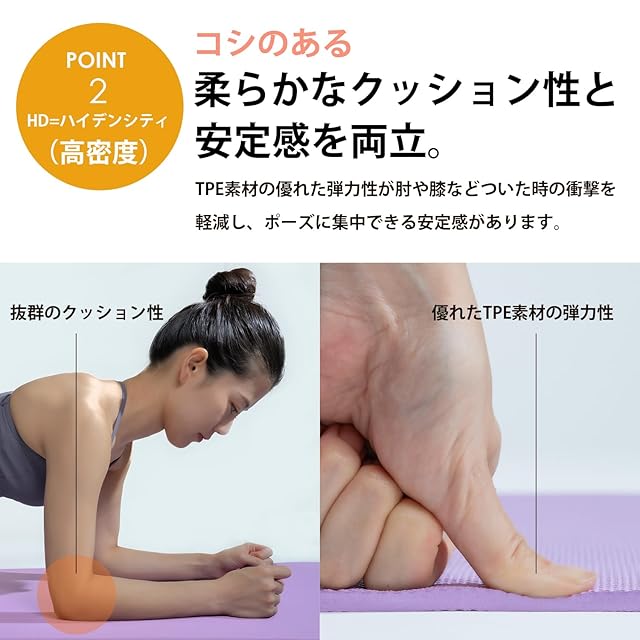 【エコロジー派にうれしい「TPE」素材を使用】使用されるフォームは、発泡率にもこだわった高密度なsuria(スリア)オリジナル。 従来のTPE使用マットにはない、コシのあるしっかりとしたクッション性。