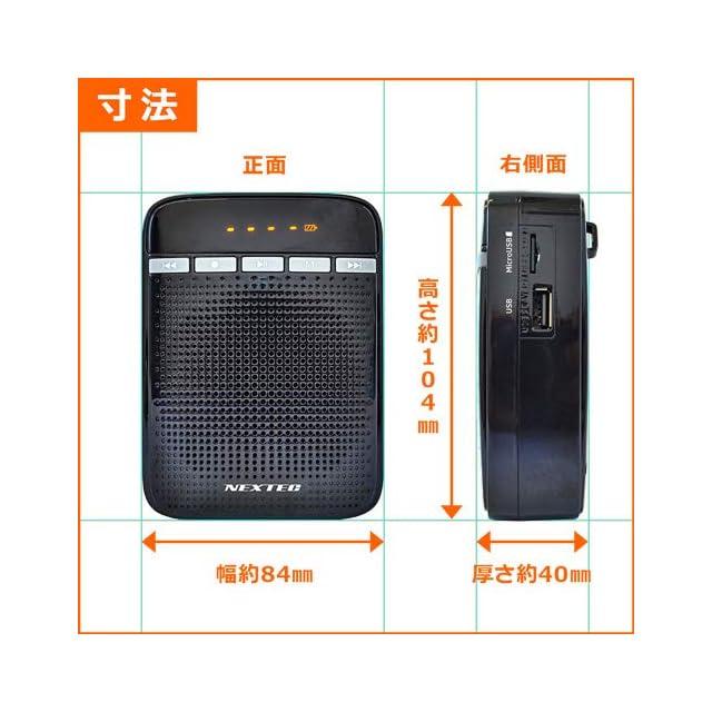 ●MP3再生機能搭載:マイクロSDカードまたはUSBメモリに保存されたMP3音楽ファイルを再生できます ●外部入力対応:外部機器(モノラル)からの音声入力に対応しています(ケーブルは付属しておりません)●同時使用可能:FMラジオ・マイクロSDカード・USBメモリ・外部機器からの音声や音楽再生中でも、マイク音声の拡声器として使用できます(マイク音声個別の音量調節はできません)●同梱物:本体・ヘッドマイク・延長ケーブル・ストラップ・ベルトクリップ・ACアダプタ及び接続ケーブル・取扱説明書